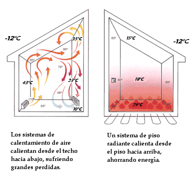 | - No afectan la presión del aire de la habitación mientras está operando. - El Uso de la energía es más eficiente alrededor del 30%. - En un estudio en Estados Unidos se comparó cientos de casas, algunas con sistemas de calefacción de aire forzado, otras con un sistema radiante, y los resultados mostraron fugas de aire mayores al 26% y un uso de energía mayor al 40% en las casas que tenían un sistema de aire forzado. |